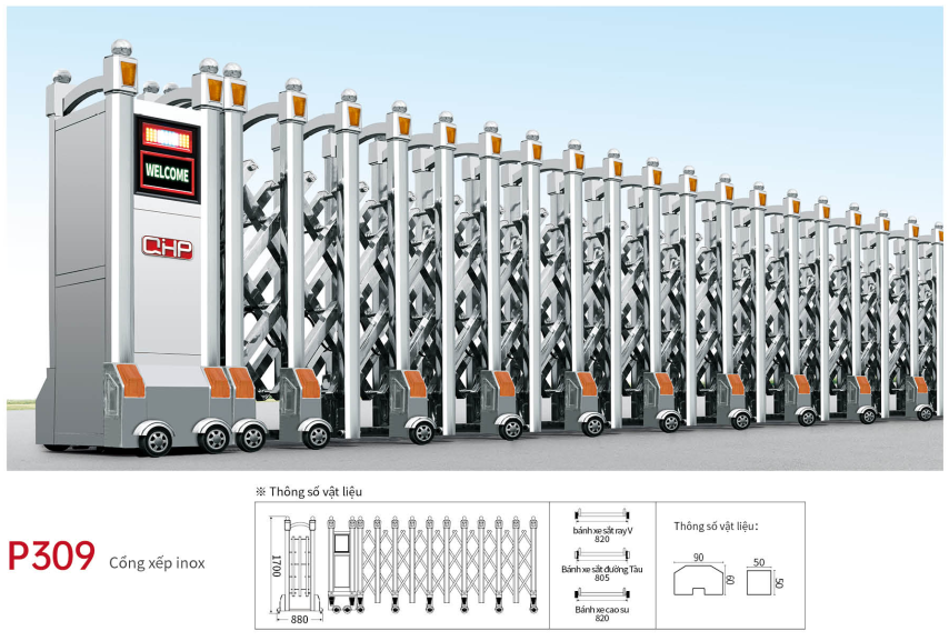 Cổng xếp P309 được chế tạo từ inox, có khả năng: